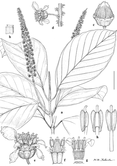 Acmanthera cowanii. a. Flowering branch. b. Stipular sheath in cross-section. c. Opening flower bud. d. Flower in inflorescence, side view, posterior petal uppermost. e. Flower, posterior petal at upper left. f. Sepal and stamens, abaxial view. g. Stamens in flower, adaxial view with gynoecium removed. h. Anthers in lateral (left), abaxial (center), and adaxial (right) views. Scale bar equivalents: a, 4 cm; b, 1 cm; c, 4 mm; d, 8 mm; e–g, 4 mm; h, 2 mm.—Based on Cowan 38597, NY. Drawn by H. M. Fukuda. First published in Contr. Univ. Michigan Herb. 11: 46. 1975; reproduced with permission of the author.