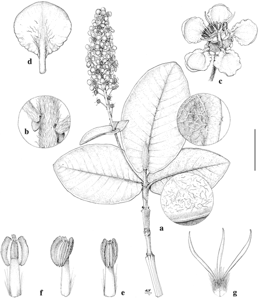 Acmanthera fernandesii. a. Flowering branch, with enlargements of adaxial (above) and abaxial (below) leaf surfaces. b. Axis of inflorescence to show small bracts and minute bracteoles. c. Flower, posterior petal uppermost. d. Petal, abaxial view. e. Stamen, natural shape, adaxial view. f. Stamens flattened to show wings and apical appendage, abaxial view (left) and adaxial view (right). g. Gynoecium.