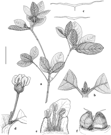 Pterandra sericea. a. Flowering branch. b. Terminal node with leaf bases and stipules. c. Hairs from abaxial surface of lamina. d. Flower in axillary fascicle. e. Three stamens opposite one petal and two sepals. f. Immature fruit with one carpel aborted. Scale bar equivalents: a, 4 cm; b, 5.7 mm; c, 0.4 mm; d, 6.7 mm; e, 2.3 mm; f, 4 mm.—Based on: a–d, f, Maguire 32715, MICH; e, Wurdack 34405, MICH. Drawn by Annette Seidenschnur Mahler. First published in Brittonia 28: 408. 1977 [‘1976’]; reproduced with permission of the author.