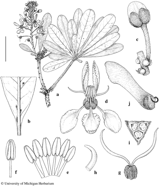 Scale bar equivalents: a, 4 cm; b, 8 mm; c, 4 mm; d, 8 mm; e–g, 4 mm; h, i, 2 mm; j, 1.3 cm. Based on McPherson 14406, MICH. Drawn by Karin Douthit. © University of Michigan Herbarium.