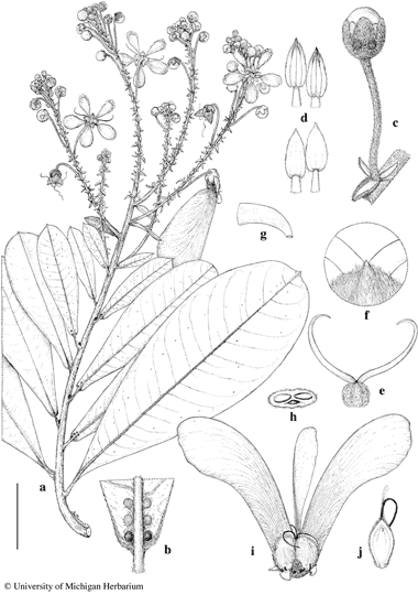 Acridocarpus plagiopterus. a. Branch with flowers and fruit. b. Base of lamina, abaxial view. c. Flower bud subtended by one bract and two bracteoles. d. Anthers, adaxial view (above) and abaxial view (below). e. Gynoecium. f. Apex of ovary, showing rudiment of third style. g. Distal portion of style. h. Cross-section of ovary, showing two fertile locules and one with the ovule abortive. i. Fruit with all three samaras developed. j. Ventral areole of the nut of a samara. Scale bar equivalents: a, 4 cm; b–e, 8 mm; f, 2 mm; g, 0.8 mm; h, 4 mm; i, 2 cm; j, 1.3 cm. Based on: a–c, Schmidt et al. 1727, MICH; d–h, Espírito Santo 1915, MO; i, j, Bequaert 84, MO. Drawn by Karin Douthit. © University of Michigan Herbarium.