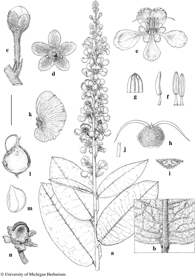 Scale bar equivalents: a, 4 cm; b, 8 mm; c, 5.7 mm; d, 8 mm; e, 1.3 cm; f, 5.7 mm; g, 2.7 mm; h, i, 5.7 mm; j, 0.4 mm; k, 4 cm; l–n, 8 mm. Based on: a–j, Jongkind 2016, MO; k–n, Jongkind 2216, MO. Drawn by Karin Douthit. © University of Michigan Herbarium.