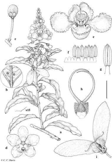 Acridocarpus zanzibaricus. a. Branch with flowers and fruits. b. Base of lamina, abaxial view. c. Flower bud subtended by a bract and two bracteoles. d. Calyx from below, showing glands on three sepals. e. Flower, with two posterior petals uppermost. f. Androecium laid out, adaxial view, three anthers removed. g. Stamen, adaxial view. h. Gynoecium, the carpel lacking a style in foreground. i. Fruit with two samaras developed. Scale bar equivalents: a, 4 cm; b, 8 mm; c, 1.3 cm; d, 5 mm; e, 1.3 cm; f, 8 mm; g, h, 4 mm; i, 1.3 cm. Based on Davis 99-23, A. Drawn by Karin Douthit. Property of C. C. Davis, reproduced with permission.