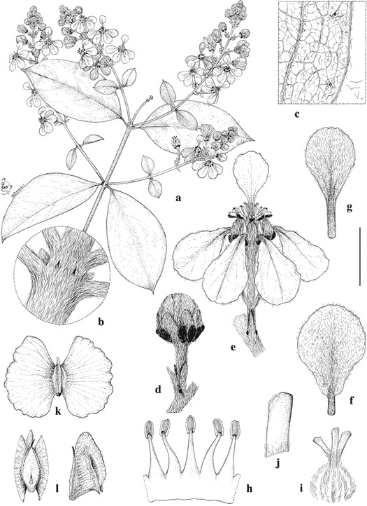 Amorimia kariniana. a. Flowering branch. b. Node with stipules. c. Abaxial surface of lamina near margin, showing glands and detached hairs. d. Flower bud. e. Flower, posterior petal uppermost. f. Lateral petal, abaxial view. g. Posterior petal, abaxial view. h. Portion of androecium laid out, abaxial view, the stamen in center opposite posterior petal. i. Gynoecium with anterior style to left. j. Distal portion of a posterior style. k. Samara, abaxial view. l. Samaras with lateral wings cut away, adaxial view (left) and side view (right). Scale bar equivalents: a, 4 cm; b, 4 mm; c, 8 mm; d, 5.7 mm; e, 8 mm; f, g, 5.7 mm; h, i, 3.3 mm; j, 1.3 mm; k, 2.7 cm; l, 1.3 cm. Based on: a–j, Harling 3026, S; k, l, Rubio & Palacios 2445, MICH. Drawn by Karin Douthit. First published in Novon 16: 182. 2006; reproduced with permission of the author.