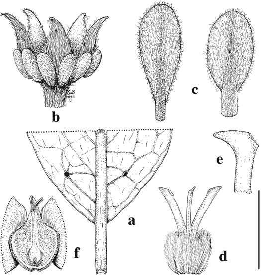 Amorimia septentrionalis. a, Base of leaf, abaxial view. b. Old flower to show shape of sepals. c. Petals, abaxial view, lateral petal (left) and posterior petal (right). d. Gynoecium with anterior style in center. e. Apex of anterior style. e. Ventral areole of samara, lateral wings cut away.
