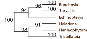 The Bunchosia clade is very strongly supported by molecular evidence—see the phylogenetic tree above, with bootstrap values above the branches, which is from Davis & Anderson (2010 [pdf]). On the other hand, in their morphology these genera are extremely diverse, especially in their fruits, which include dry and fleshy fruits, dehiscent and indehiscent fruits, and dry fruits with the walls smooth or bearing several different kinds of outgrowths. Because of this fruit diversity, Niedenzu (1928) placed these six genera in four different tribes, and even in the two cases where he put pairs of genera in the same tribe (Heladena and Thryallis, Echinopterys and Henleophytum), our tree puts the members of those pairs in different subclades, indicating that they are not sisters in either case. Most of the shared characters given in the description above (pseudoracemose inflorescences, yellow petals, ten fertile stamens with the anthers ± alike) are probably symplesiomorphic in this clade. One possible synapomorphy for the clade is the distinct, persistent stipules borne adaxially on the base of the petiole. The pollen is also similar and relatively derived, as was noted for Bunchosia, Heladena, Henleophytum, and Thryallis by Lowrie (1982). The beauty of the Bunchosia clade is that it serves as a convenient, if surprising, repository for a group of genera that are all more or less isolated in their morphological characters, a sort of refuge for derived groups that would otherwise have no home.