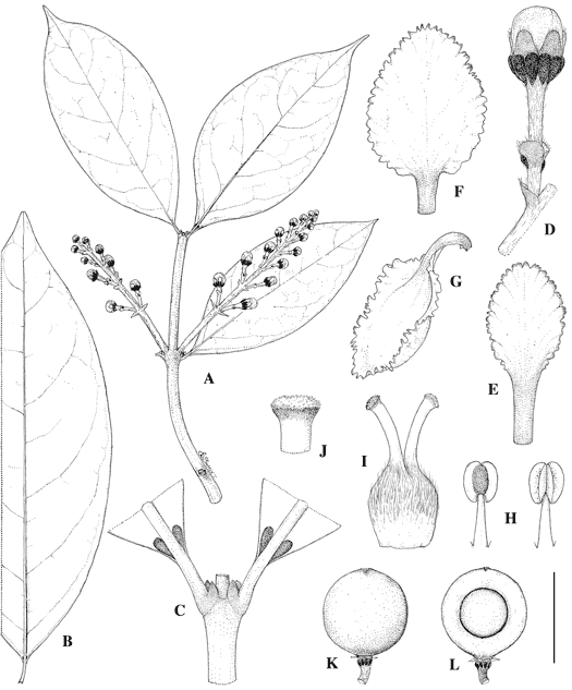 Bunchosia andina. A. Branch with inflorescences in bud. B. Large leaf, abaxial view. C. Node with base of leaves, abaxial view, showing stipules and glands. D. Flower bud. E. Posterior petal, adaxial view. F. Posterior-lateral petal, adaxial view. G. Anterior-lateral petal, lateral view. H. Stamens, abaxial view (left) and adaxial view (right). I. Gynoecium. J. Apex of style. K. Intact fruit. L. Fruit in longitudinal section to show thick flesh and one large seed. Scale bar equivalents: A, B, 4 cm; C, 4 mm; D, 8 mm; E–H, 4 mm; I, 2 mm; J, 1 mm; K, L, 4 cm. Based on: A, C–J, Holmgren 401 (S); B, Cuatrecasas 21949 (F); K, García-Barriga 17606 (AAU); L, Cerón et al. 923 (MO). Drawn by Karin Douthit. First published in Edinb. J. Bot. 77: 496. 2020; reproduced with permission of the author.
