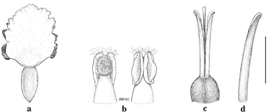 Bunchosia anomala. a. Posterior petal, adaxial view. b. Anthers, abaxial view (left) and adaxial view (right). d. Gynoecium. d. Distal portion of style, lateral view, showing the elongated stigma. Scale bar equivalents: a, 4.5 mm; b, 2 mm; c, 3 mm; d, 1.5 mm. Based on Callejas et al. 9292, MICH. Drawn by Karin Douthit. First published in Contr. Univ. Michigan Herb. 20: 17. 1995; reproduced with permission of the author.