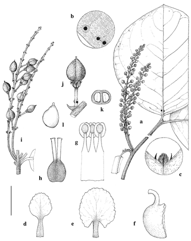 Bunchosia cuscana. a. Branch with paired inflorescences in bud. b. Detail of abaxial leaf surface with marginal leaf glands. c. Detail of branch apex, showing stipules. d. Posterior petal. e. Posterior-lateral petal. f. Anterior-lateral petal. g. Portion of androecium. h. Gynoecium. i. Portion of stem with paired infructescences. j. Fruit borne on subsessile pedicel, subtended by bracteoles and bract. k. Cross-section of fruit. l. Embryo. Scale bar equivalents: a, i, 4 cm; b, 8 mm; c–f, 4 mm; g, h, 2 mm; j, k, 2 cm; l, 1.3 cm. Based on: a, d–h, Valenzuela et al. 1890 (MICH); b, c Valenzuela et al. 5406 (MICH); i–l, Calatayud & Suclli 1856 (MICH). Drawn by Karin Douthit. First published in Brittonia 67: 243. 2015; reproduced with permission of the authors.