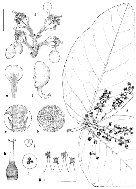 Bunchosia hedraiophylla. a. Branch with inflorescence in bud. b. Detail of abaxial leaf surface with leaf gland. c. Detail of rudimentary petiole and pair of stipules. d. Apical portion of inflorescence. e. Posterior petal. f. Lateral petal. g. Portion of androecium. h. Gynoecium. i. Stigma. j. Cross-section of ovary.