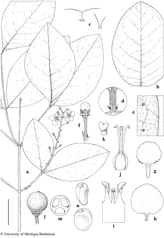 Bunchosia mollis. a. Flowering branch. b. Detached large leaf, abaxial view. c. Hairs from abaxial surface of lamina. d. Petiole with stipules, adaxial view. e. Abaxial surface of lamina, showing glands. f. Flower bud. g. Posterior petal. h. Lateral petal. i. Stamens, abaxial view, the short stamen in center opposite posterior petal. j. Gynoecium. k. Apex of style. l. Fruit. m. Cross-section of fruit. n. Embryo, two views. Scale bar equivalents: a, b, 4 cm; c, 0.8 mm; d, 4 mm; e–h, 8 mm; i, j, 2.7 mm; k, 1 mm; l, m, 1.3 cm; n, 1 cm. Based on: a, c–e, Hopkins et al. 579, MICH; b, Clarke 513, MICH; f–k, Prance et al. 9546, MICH; l–n, Lima et al. 818, MICH. Drawn by Karin Douthit. © University of Michigan Herbarium.
