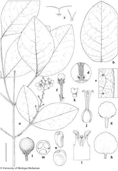 Bunchosia mollis. a. Flowering branch. b. Detached large leaf, abaxial view. c. Hairs from abaxial surface of lamina. d. Petiole with stipules, adaxial view. e. Abaxial surface of lamina, showing glands. f. Flower bud. g. Posterior petal. h. Lateral petal. i. Stamens, abaxial view, the short stamen in center opposite posterior petal. j. Gynoecium. k. Apex of style. l. Fruit. m. Cross-section of fruit. n. Embryo, two views. Scale bar equivalents: a, b, 4 cm; c, 0.8 mm; d, 4 mm; e–h, 8 mm; i, j, 2.7 mm; k, 1 mm; l, m, 1.3 cm; n, 1 cm. Based on: a, c–e, Hopkins et al. 579, MICH; b, Clarke 513, MICH; f–k, Prance et al. 9546, MICH; l–n, Lima et al. 818, MICH. Drawn by Karin Douthit. © University of Michigan Herbarium.