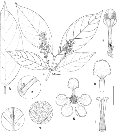 Bunchosia neillii. a. Flowering branch. b. Large leaf, adaxial view. c. Base of petiole bearing stipules. d. Base of lamina, abaxial view, showing paired glands. e. Detail showing leaf venation, abaxial view. f. Flower bud. g. Flower, posterior petal uppermost. h. Posterior petal. i. Gynoecium. Scale bar equivalents: a, b, 4 cm; c, 4 mm; d, 8 mm; e, f, 4 mm; g, 8 mm; h, 5 mm; i, 2.7 mm. (Based on Neill et al. 10275, MICH). Drawn by Karin Douthit. First published in Brittonia 67: 247. 2015; reproduced with permission of the authors.