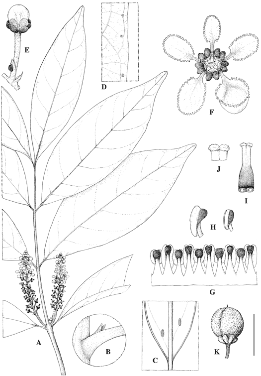 Bunchosia parrae. A. Flowering branch. B. Base of petiole to show stipules. C. Enlargement of base of abaxial surface of lamina to show glands. D. Enlargement of distal portion of abaxial lamina near margin to show glands. E. Flower bud. F. Flower, posterior petal uppermost. G. Androecium, abaxial view, the stamen fifth from left opposite posterior petal. H. Lateral views of two anthers, from opposite sepal (left) and opposite petal (right). I. Gynoecium. J. Terminal portion of coherent styles. K. Fruit. Scale bar equivalents: A, 4 cm; B, 4 mm; C, D, 8 mm; E, 5.7 mm; F, 5 mm; G, 2.7 mm; H, 2 mm; I, 2.7 mm; J, 2 mm; K, 1.3 cm. Based on: A–J, Lewis et al. 11230 (MO); K, Lewis et al. 11417 (MO). Drawn by Karin Douthit. First published in Edinb. J. Bot. 77: 500. 2020; reproduced with permission of the author.