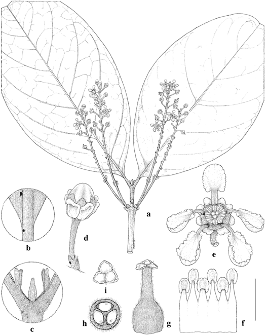 Scale bar equivalents: A, 4 cm; B, c, 8 mm; D, 9 mm; E, 4 mm; F–I, 2 mm. Based on Soejarto 2919, MO. Drawn by Karin Douthit. First published by W. R. Anderson in Acta Botanica Mexicana 109: 25. 2014.