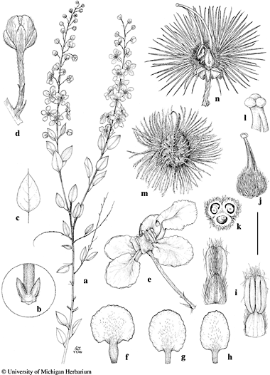 Echinopterys. a–m, E. eglandulosa. a. Flowering branch. b. Base of petiole, adaxial view, to show stipules. c. Detached leaf. d. Flower bud. e. Flower, posterior petal at upper right. f. Posterior petal, abaxial view. g. Posterior-lateral petal, abaxial view. h. Anterior-lateral petal, abaxial view. i. Stamens, abaxial view (left) and adaxial view (right). j. Gynoecium. k. Cross-section of ovary. l. Coherent apices of styles. m. Mericarp, abaxial view. n, E. setosa. Mature fruit, one mericarp removed, the other two mericarps separating from torus. Scale bar equivalents: a, 4 cm; b, 2 mm; c, 4 cm; d, 6.7 mm; e–h, 8 mm; i, 2 mm; j, k, 2.7 mm; l, 1 mm; m, n, 4 mm. Based on: a, b, d, Feddema 2370, MICH; c, e–m, McVaugh 25850, MICH; n, Muller 3281, MICH. Drawn by Karin Douthit. © University of Michigan Herbarium.