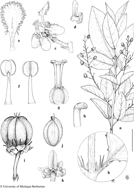 Heladena multiflora. a. Fruiting branch. b. Node with stipules and base of leaf. c. Flower, side view, posterior petal uppermost. d. Sepal with stalked glands. e. Posterior petal, abaxial view. f. Stamens, abaxial view (left) and adaxial view (right). g. Gynoecium. h. Apex of style. i. Fruit. j. Coccus, adaxial view. k. Pyramidal torus after fall of cocci. Scale bar equivalents: a, 3 cm; b, 3 mm; c, 6 mm; d, 3 mm; e, 3.8 mm; f, g, 1.5 mm; h, 1 mm; i–k, 3.8 mm. Based on: a, b, Ahumada & Schinini 4009, MICH; c–h, Krapovickas et al. 25892, MICH; i–k, Schulz 7639, MICH. Drawn by Karin Douthit. © University of Michigan Herbarium.