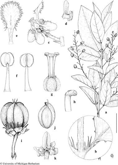 Heladena multiflora. a. Fruiting branch. b. Node with stipules and base of leaf. c. Flower, side view, posterior petal uppermost. d. Sepal with stalked glands. e. Posterior petal, abaxial view. f. Stamens, abaxial view (left) and adaxial view (right). g. Gynoecium. h. Apex of style. i. Fruit. j. Coccus, adaxial view. k. Pyramidal torus after fall of cocci.
