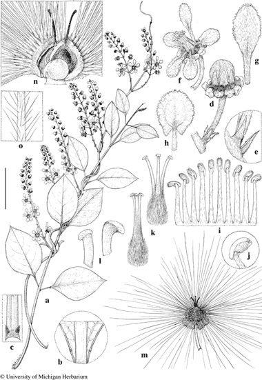 Henleophytum echinatum. a. Flowering and leafy stems. b. Base of lamina with marginal glands, abaxial view. c. Stipules on adaxial face of base of petiole. d. Flower bud. e. Base of pedicel to show bract and bracteoles. f. Flower, posterior petal uppermost. g. Posterior petal, abaxial view. h. Lateral petal, adaxial view. i. Androecium laid out, abaxial view, stamen on left opposite posterior petal. j. Anther, side view. k. Young gynoecium with styles coherent (left) and older gynoecium with styles divergent (above). l. Stigmas from anterior style (left) and posterior style (above). m. Intact fruit. n. Two mericarps separating from torus. n. Hairy shaft of one fruit-seta. Scale bar equivalents: a, 4 cm; b, 4 mm; c, 2.7 mm; d, 4 mm; e, 2 mm; f, 8 mm; g, h, 4 mm; i, 2.7 mm; j, 1.3 mm; k, 2.7 mm; l, 1 mm; m, 8 mm; n, 1.3 mm; o, 0.4 mm. Based on: a–l, Britton & Wilson 5646, NY; m–o, Britton et al. 10297, NY. Drawn by Karin Douthit. © University of Michigan Herbarium.