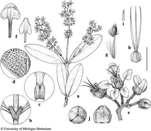 Blepharandra angustifolia. a. Flowering branch. b. Node with stipules. c. Adaxial view of petiole with pair of stipules, hairs removed. d. Venation of lamina, abaxial surface. e. Cincinnus, oldest flower at left. f. Posterior petal (left) and lateral petal (right), adaxial views. g. Stamen, lateral view. h. Gynoecium. i. Apex of style. j. Fruits, view from above (left) and from side (right). Scale bar equivalents: a, 4 cm; b, c, 8 mm; d, 4 mm; e, 8 mm; f, 5 mm; g, h, 2.7 mm; i, 0.8 mm; j, 4 mm.—Based on: a, b, Maguire & Wurdack 34480, MICH; c, j, Davidse et al. 17055, MICH; d, g–i, Huber & Medina 5860, MICH; e, f, Huber 3391, MICH. Drawn by Karin Douthit. © University of Michigan Herbarium.