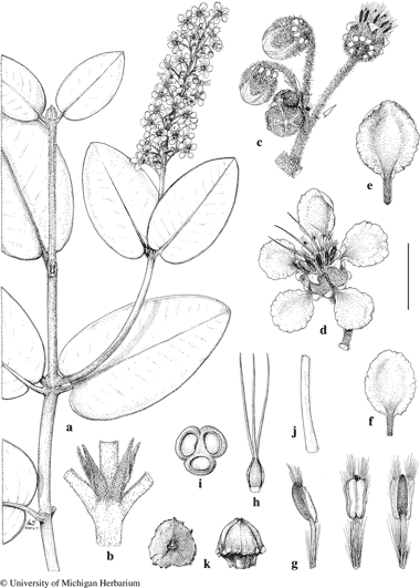 Blepharandra hypoleuca. a. Flowering branch. b. Node with stipules. c. Cincinnus, with one deciduous bracteole falling away. d. Flower, posterior petal uppermost. e. Posterior petal, adaxial view. f. Lateral petal, adaxial view. g. Stamens, lateral view (left), adaxial view (center), abaxial view (right). h. Gynoecium. i. Ovary, cross-section. j. Apex of style. k. Fruits, view from above (left) and from side (right). Scale bar equivalents: a, 4 cm; b, 1.3 cm; c, 8 mm; d, 6.7 mm; e, f, 5 mm; g, 2.7 mm; h, 5 mm; i, 1.3 mm; j, 0.4 mm; k, 5 mm.—Based on: a, d–j, Maguire & Wurdack 33920, MICH; b, c, McDowell 2875, MICH; k, Gillespie 2842, MICH. Drawn by Karin Douthit. © University of Michigan Herbarium.
