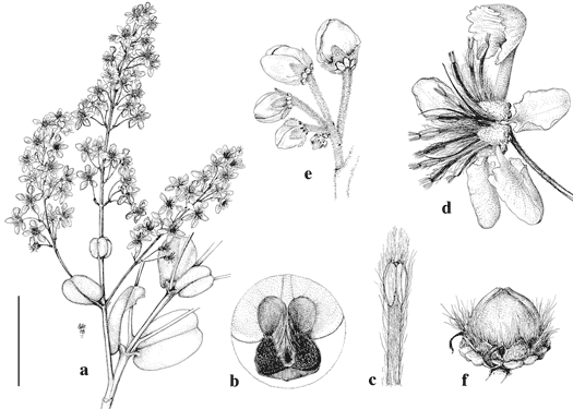 Blepharandra intermedia. a. Flowering branch. b. Petiole and stipules, adaxial view. c. Cincinnus. d. Flower, posterior petal uppermost. e. Stamen, adaxial view. f. Fruit. Scale bar equivalents: a, 4 cm; b, c, 8 mm; d, 5.7 mm; e, 2.7 mm; f, 3.3 mm.—Based on: a, b, d–f, Pires et al. 14493, MICH; c, Pires & Leite 14840, NY. Drawn by Karin Douthit. First published in Mem. New York Bot. Gard. 32: 86. 1981; reproduced with permission of the author.