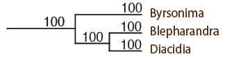 The Byrsonima clade is very strongly supported by both molecular and morphological evidence. The phylogenetic tree shown above is from Davis & Anderson (2010 [pdf]); the numbers above the branches are bootstrap values. Especially noteworthy among the morphological characters supporting the clade are the completely eglandular leaves, a condition found in few genera of Malpighiaceae, and the indehiscent stone of the fruit, which is unique in the family. Of the three genera in this wholly American clade, two are limited to northern South America, while the third, Byrsonima, is one of the largest and most widely distributed genera of the family.