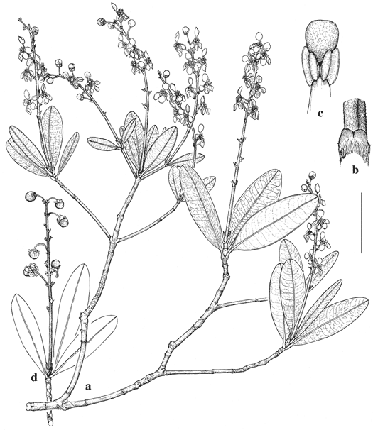Scale bar equivalents: a, 4 cm; b, 3.6 mm; c, 2 mm; d, 4 cm.—Based on: a–c, Maguire et al. 34612A, NY; d, Vareschi & Jaffe 8006, VEN. Drawn by Melissa Marshall. First published in Mem. New York Bot. Gard. 32: 108. 1981; reproduced with permission of the author.