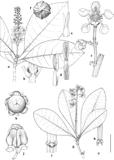 Byrsonima. a–f, B. cacaophila. a. Flowering branch. b. Node with connate intrapetiolar stipules. c. Two-flowered cincinnus, the open flower with posterior petal uppermost. d. Stamens, side view (left) and adaxial view (right). e. Gynoecium, anterior style to left. f. Fruit (dried) from above. g–k, B. bahiana. g. Fruiting branch. h. Adaxial view of petile to show distinct intrapetiolar stipules. i. Node of inflorescence axis to show bract and bracteoles. j. Immature fruit with enlarged sepals and persistent petals. k. Fruit from above. Scale bar equivalents: a, 4 cm; b, 1 cm; c, 8 mm; d, 2.7 mm; e, 4 mm; f, 2 cm; g, 4 cm; h, 8 mm; i, 4 mm; j, 1 cm; k, 1.5 cm.—Based on: a–e, Belém & Pinheiro 2881, CEPEC; f, Belém & Magalhães 637, CEPEC; g–k, Harley 18475, MICH. Drawn by Karin Douthit. First published in Contr. Univ. Michigan Herb. 15: 99. 1982; reproduced with permission of the author.