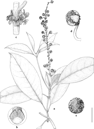 Byrsonima flexipes. a. Fruiting branch. b. Base of petiole, adaxial view, to show stipules. c. Inflorescence axis showing bracts, bracteoles, and base of one pedicel. d. Enlarging fruit closely invested by accrescent sepals. e. Fruit from above. Scale bar equivalents: a, 4 cm; b, c, 4 mm; d, 8 mm; e, 6.7 mm.—Based on Velazco 831, MICH. Drawn by Karin Douthit. First published in Contr. Univ. Michigan Herb. 23: 70. 2001; reproduced with permission of the author.