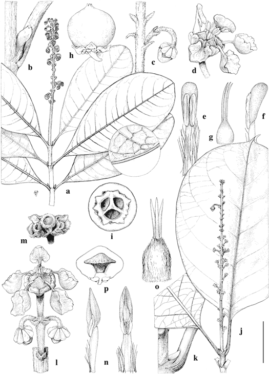 Byrsonima. a–i. B. fonsecae. a. Flowering branch, with enlargement of abaxial leaf surface. b. Stipules. c. Portion of inflorescence with pedunculate flower bud. d. Flower, posterior petal uppermost. e. Stamen, adaxial view. f. Anther, side view. g. Gynoecium, with styles bent away from posterior petal. h. Fruit. i. Cross-section of fruit, showing stone with three locules. j–p. B. souzae. j. Leaves and axis of inflorescence. k. Stipules. l. Reconstructed cymule, the flower with posterior petal uppermost. m. Apex of peduncle to show bracteoles of cymule. n. Stamens, side view (left) and adaxial view (right). o. Gynoecium. p. Fruit, with flesh and base in longitudinal section to expose the nut. Scale bar equivalents: a, 4 cm (1 cm); b, 5.7 mm; c, d, 8 mm; e, f, 2 mm; g, 4 mm; h, i, 1.3 mm; j, 4 cm; k, 1.3 cm; l, 8 mm; m, 2.7 mm; n, o, 2 mm; p, 2.7 cm.—Based on: a–i, Anderson et al. 36183, MICH; j–o, Rodrigues & Coelho 2462, INPA; p, Rodrigues & Loureiro 7168, INPA. Drawn by Karin Douthit. First published in Contr. Univ. Michigan Herb. 15: 108. 1982; reproduced with permission of the author.