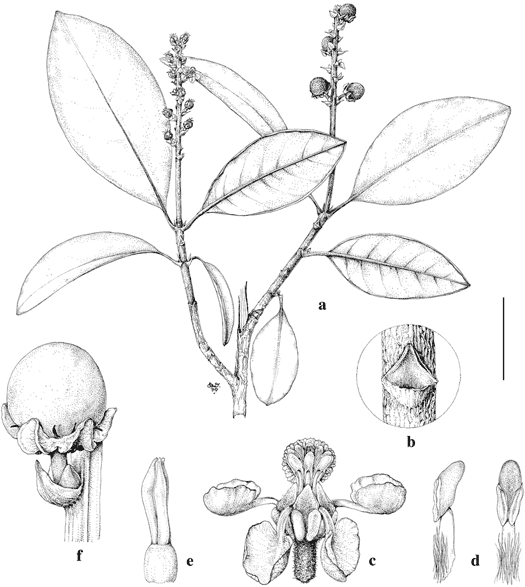 Byrsonima kariniana. a. Branches with flowers and fruits. b. Stipules against stem, petiole removed. c. Flower (including entire pedicel), posterior petal uppermost. d. Stamens, side view (left) and adaxial view (right). e. Gynoecium. f. Fruit.
