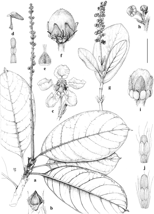 g–j, B. tillettii. g. Branch with inflorescence. h. Two-flowered cincinnus. i. Flower bud. j. Immature stamens from bud, opposite a petal (above) and opposite a sepal (below).