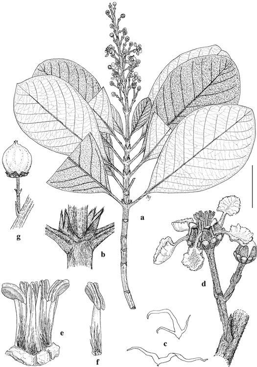 Byrsonima maguirei. a. Flowering branch. b. Node with stipules. c. Hairs from inflorescence axis. d. Flower, posterior petal at upper right. e. Gynoecium and five stamens. f. Stamen, oblique-adaxial view. g. Fruit.