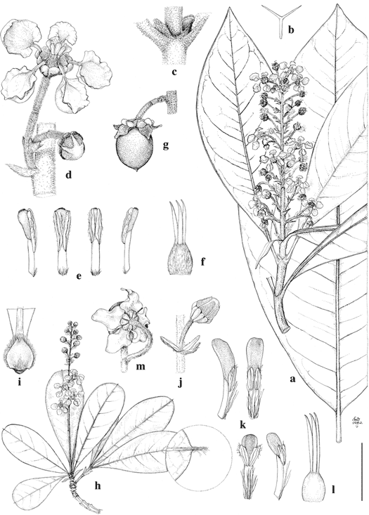 h–m, B. surinamensis. h. Flowering branch, with leaf tip enlarged. i. Stipules on adaxial face of base of petiole. j. Flower bud subtended by bract and bracteoles. k. Stamens, with longer and shorter anthers from same flower. l. Gynoecium. m. Fruit, drawn from behind to show enlarged sepals and twisted pedicel.
