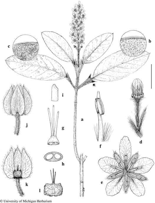 Diacidia vestita. a. Flowering branch (stipules at arrow laid open). b. Adaxial surface of lamina. c. Abaxial surface of lamina. d. Flower bud. e. Flower from above, laid open to show distribution of the eight stamens, posterior petal uppermost. f. Stamen. g. Gynoecium. h. Cross-section of ovary. i. Apex of style. j. Fruiting calyx. k. Fruit in situ, surrounded by three enlarged sepals, the anterior two sepals cut away. l. Fruit. Scale bar equivalents: a, 4 cm; b, c, 4 mm; d, 8 mm; e, 5.7 mm; f, 1.9 mm; g, 2 mm; h, 1.3 mm; i, 0.4 mm; j, k, 1 cm; l, 4 mm.—Based on: a–c, e–l, Liesner 18536, MICH; d, Maguire et al. 30091, MICH. Drawn by Karin Douthit. © University of Michigan Herbarium.