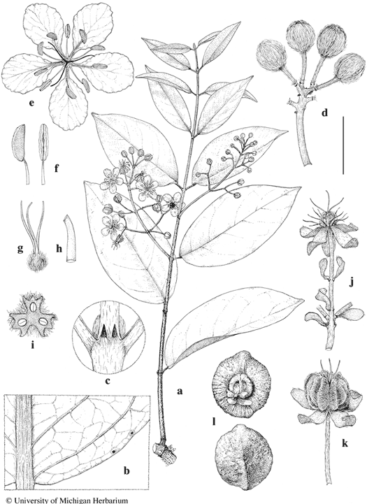 Flabellariopsis acuminata. a. Flowering branch. b. Base of lamina, abaxial view, showing glands set in from margin. c. Node, showing interpetiolar stipules. d. Umbel of flower buds. e. Flower from above, calyx omitted. f. Anthers, lateral view (left) and adaxial view (right). g. Gynoecium. h. Distal portion of style. i. Cross-section of ovary. j. Old flower with bract and bracteoles. k. Maturing fruit with developing winglets. l. Mature fruit, adaxial view above, abaxial view below.