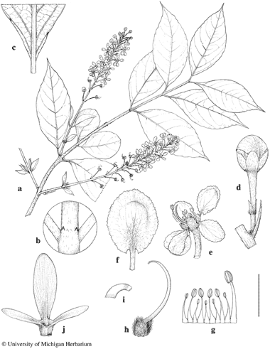 Hiptage minor. a. Flowering branch. b. Node with interpetiolar stipules. c. Base of lamina with marginal glands, abaxial view. d. Flower bud with pedicel, bracteoles, peduncle, and subtending bract. e. Flower, posterior petal at upper right. f. Posterior petal, abaxial view, showing hairs in center of limb and on claw. g. Androecium laid flat, adaxial view, the stamen fifth from left opposite posterior petal, the large stamen opposite anterior sepal. h. Gynoecium. i. Apex of style. j. Samara. Scale bar equivalents: a, 4 cm; b, 4 mm; c, 8 mm; d, 4 mm; e, 8 mm; f, g, 4 mm; h, 2.7 mm; i, 0.8 mm; j, 1.3 cm. Based on: a, b, Henry 10792B, NY; c–i, Forrest 25461, NY; j, Henry 10792A, NY. Drawn by Karin Douthit. © University of Michigan Herbarium.