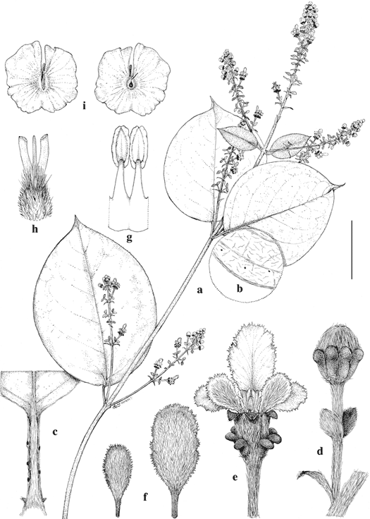 Alicia anisopetala. a. Flowering branch. b. Abaxial surface of lamina enlarged to show tiny glands. c. Adaxial view of petiole to show small glands and basal stipules. d. Flower bud. e. Flower, posterior petal uppermost. f. Abaxial views of lateral petal (left) and posterior petal (right). g. Abaxial view of two stamens. h. Gynoecium. i. Samaras, abaxial view (left) and adaxial view (right). Scale bar equivalents: a, 4 cm; b, 8 mm; c, 5 mm; d–f, 4 mm; g, h, 2 mm; i, 2.7 cm. Based on: a–d, Anderson 10176, MICH; e–i, Anderson 11786, MICH. Drawn by Karin Douthit. First published in Novon 16: 177. 2006; reproduced with permission of the author.