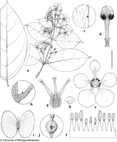 Callaeum malpighioides. a. Flowering branch, with large leaf at left. b. Base of petiole bearing stipules. c. Margin of lamina with gland, abaxial view. d. Flower bud. e. Flower, posterior petal uppermost. f. Androecium laid out, adaxial view, the three smaller stamens opposite posterior petal and adjacent sepals. g. Gynoecium, anterior style in center. h. Stigma, adaxial view. i. Samara, abaxial view. j. Ventral areole of samara. Scale bar equivalents: a, 4 cm; b, c, 4 mm; d, 8 mm; e, 1 cm; f, g, 2.7 mm; h, 1.3 mm; i, 4 cm; j, 8 mm. Based on: a–h, Calzada 1687, MICH; i, j, Balick 3356, MICH. Drawn by Karin Douthit. © University of Michigan Herbarium.