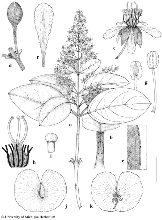 Flabellaria paniculata. a. Flowering branch. b. Petiole, adaxial view. c. Margin of lamina, abaxial view. d. Flower bud. e. Flower. f. Petal, abaxial view. g. Anther, abaxial view (left) and adaxial view (right). h. Gynoecium, surrounded by filaments. i. Stigma. j. Samara, abaxial view. k. Samara still attached to old flower, adaxial view.