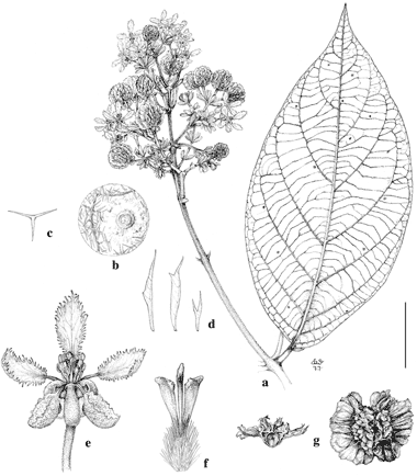 Jubelina magnifica. a. Flowering branch. b. Abaxial surface of lamina, with gland and hairs. c. Hair from abaxial surface of lamina. d. Stem hairs. e. Flower, posterior petal uppermost. f. Gynoecium. g. Samara, abaxial view (right) and cross-section (left). Scale bar equivalents: a, 4 cm; b, 2 mm; c, d, 0.8 mm; e, 8 mm; f, 2 mm; g, 4 cm. Based on: a–f, Maguire et al. 36748, NY; g, Wurdack & Adderley 43579, NY. Drawn by Karin Douthit. First published in Mem. New York Bot. Gard. 32: 229. 1981; reproduced with permission of the author.