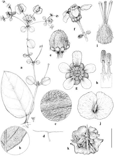 Scale bar equivalents: a, 3 cm; b, 8 mm; c, 1 mm; d, 0.6 mm; e, 3 mm; f, 6 mm; g, 5 mm; h, i, 2 mm; j, 2 cm; k, 1 cm. Based on: a, c, d, j, Gleason 825, NY; b, h, Cremers 8143, MICH; e, f, i, Forest Dept. 3644, NY; g, Maas & Westra 3563, MICH; k, Ducke 1169, NY. Drawn by Karin Douthit. Modified from a drawing first published in Mem. New York Bot. Gard. 32: 214. 1981; reproduced with permission of the author.