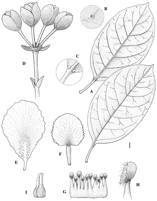 Mezia andersonii. A. Leaf, abaxial view above, adaxial view below. B. Detail showing gland inside margin. C. Base of lamina, abaxial view. D. Umbel of four flower buds. E. Lateral petal, abaxial view. F. Posterior petal, abaxial view. G. Androecium, abaxial view, third stamen from right opposing posterior petal. H. Anther and portion of filament. I. Gynoecium, anterior style at left. Scale bar equivalents: A, 1 cm; B, 5 mm; C, 3 mm; D, 1 mm; E–G, 1 mm; H, 0.2 mm; I, 1 mm. Based on Tillett 672-136, US. Drawn by John Megahan. First published online, Edinburgh J. Bot. in 2018; reproduced with permission of the authors.