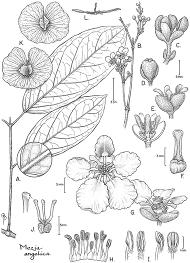 Mezia angelica. A. Leafy stem, with enlargement of abaxial surface to show persistent hairs. B. Part of inflorescence. C. Umbel of four flower buds. D. Opening flower bud. E. Flower with petals removed, subtended by persistent bracteoles (above), and same with bracteoles half cut away (below), the eglandular anterior sepal in center. F. Abaxial view of lateral sepal with two nearly connate glands. G. Flower from above with posterior petal uppermost (left) and lateral view with two petals removed and posterior petal to the right (right). H. Androecium laid out, adaxial view, the shortest stamen (fifth from right) opposite posterior petal. I. Lateral (far left) and adaxial (near left) views of anthers opposite petals, and lateral (near right) and adaxial (far right) views of anthers opposite sepals. J. Gynoecium with anterior style in center (right) and enlargement of style apex (above). K. Samaras, abaxial view (above) and adaxial view (below). L. Cross-section of samara showing large lateral wing, smaller dorsal wing, single winglets between dorsal and lateral wings, and single winglets outside lateral wing. Based on: A–J, Mori et al. 20945, NY; K, L, Silva 2830, NY. Drawn by Bobbi Angell. Reproduced with permission from Mem. New York Bot. Gard. 76(2): 424. 2002. © B. Angell.