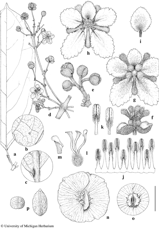 Mezia beckii. a. Large leaf, abaxial view. b. Enlargement of abaxial surface of lamina. c. Glands at base of lamina, abaxial view. d. Inflorescence. e. Umbel of flower buds. f. Flower subtended by bracteoles, anterior sepal in center, petals removed (note gland on one bracteole). g. Flower from below, posterior petal uppermost. h. Flower from above, posterior petal uppermost. i. Posterior petal, abaxial view. j. Androecium laid out, abaxial view, stamen above "j" opposite posterior petal. k. Anthers, adaxial view, from opposite sepal (left) and from opposite petal (right). l. Gynoecium, anterior style at left. m. Distal portion of style. n. Samara, abaxial view. o. Nut of samara, adaxial view. p. Embryo, from below (left) and from side (right). Scale bar equivalents: a, 4 cm; b, c, 8 mm; d, 4 cm; e, 1.3 cm; f–h, 8 mm; i, 5.7 mm; j, 3.3 mm; k, 2.7 mm; l, 3.3 mm; m, 1.7 mm; n, o, 4 cm; p, 1 cm. Based on: a–m, Beck et al. 19513, MICH; n–p, Jardim 2397, MICH. Drawn by Karin Douthit. First published online, Edinburgh J. Bot. in 2018; reproduced with permission of the authors.