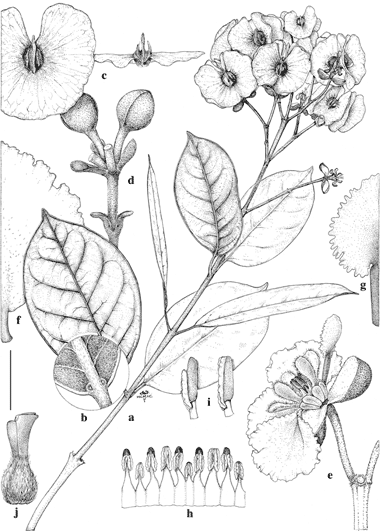 Mezia huberi. Fruiting branch. b. Base of lamina, abaxial view. c. Samara, abaxial view (left) and lateral view looking into apical notch (right). d. Umbel of flower buds, with two buds removed. e. Flower, posterior petal at upper right, one posterior-lateral petal removed. f. Lateral petal, abaxial view. g. Posterior petal, abaxial view. h. Androecium laid out, adaxial view, the stamen fifth from right opposite posterior petal. i. Anthers, lateral view, from opposite a sepal (left) and opposite a posterior-lateral petal (right). j. Gynoecium, lateral view, anterior style to left. Scale bar equivalents: a, 4 cm; b, 8 mm; c, 2 cm; d, e, 8 mm; f–h, 4 mm; i, 2 mm; j, 2.7 mm. Based on: a–c, Huber 4497, MICH; d–j, Huber 449, MICH. Drawn by Karin Douthit. First published in Contr. Univ. Michigan Herb. 19: 385. 1993; reproduced with permission of the author.
