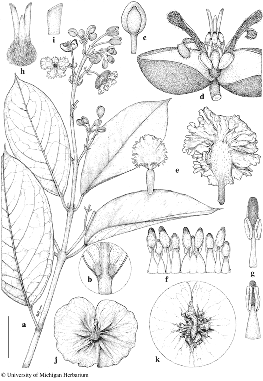 Scale bar equivalents: a, 4 cm; b, 8 mm; c, 1 cm; d, e, 6.7 mm; f, 4 mm; g, 2.7 mm; h, 4 mm; i, 2 mm; j, 4 cm; k, 2 cm. Based on: a–i, Tillett et al. 45136 (MICH); j, k, Mori et al. 23727 (MICH). Drawn by Karin Douthit. First published online, Edinburgh J. Bot. in 2018; reproduced with permission of the authors.