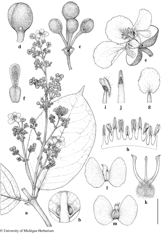 Mezia mariposa. a. Flowering branch. b. Base of lamina with glands, abaxial view. c. Umbel of flower buds. d. Flower bud enclosed in bracteoles. e. Flower subtended by bracteoles, posterior petal at upper right, two lateral petals removed. f. Lateral sepal, abaxial view. g. Posterior petal, abaxial view. h. Androecium laid out, adaxial view, the stamen fifth from left opposite posterior petal. i. Anther opposite sepal, lateral view. j. Anther opposite posterior-lateral petal, abaxial view. k. Gynoecium, anterior style in center. l. Samara, abaxial view. m. Samara, adaxial view. Scale bar equivalents: a, 4 cm; b, c, 8 mm; d, 4 mm; e, 8 mm; f, 5 mm; g, 8 mm; h, 4 mm; i–k, 2.7 mm; l, m, 4 cm. Based on: a–k, Prance et al. 6633, MICH; l, m, Prance et al. 2586, NY. Drawn by Karin Douthit. First published online, Edinburgh J. Bot. in 2018; reproduced with permission of the authors.