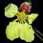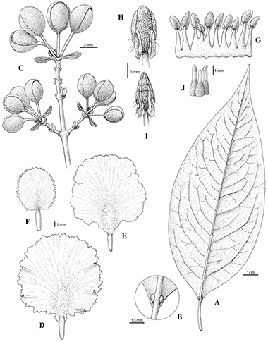 Mezia peruviana. A. Leaf, abaxial view. B. Detail showing basal glands. C. Distal portion of inflorescence with umbels in bud. D. Anterior-lateral petal, abaxial view. E. Posterior-lateral petal, abaxial view. F. Posterior petal, abaxial view. G. Androecium, abaxial view, fourth stamen from left opposing posterior petal. H. Anther opposite sepal, front view. I. Anther opposite petal, front view. J. Gynoecium, anterior style in center. Based on: A–C and G–I, Revilla 3659A, MICH; D–F, Tessmann 4564, G. Drawn by John Megahan. First published online, Edinburgh J. Bot. in 2018; reproduced with permission of the authors.